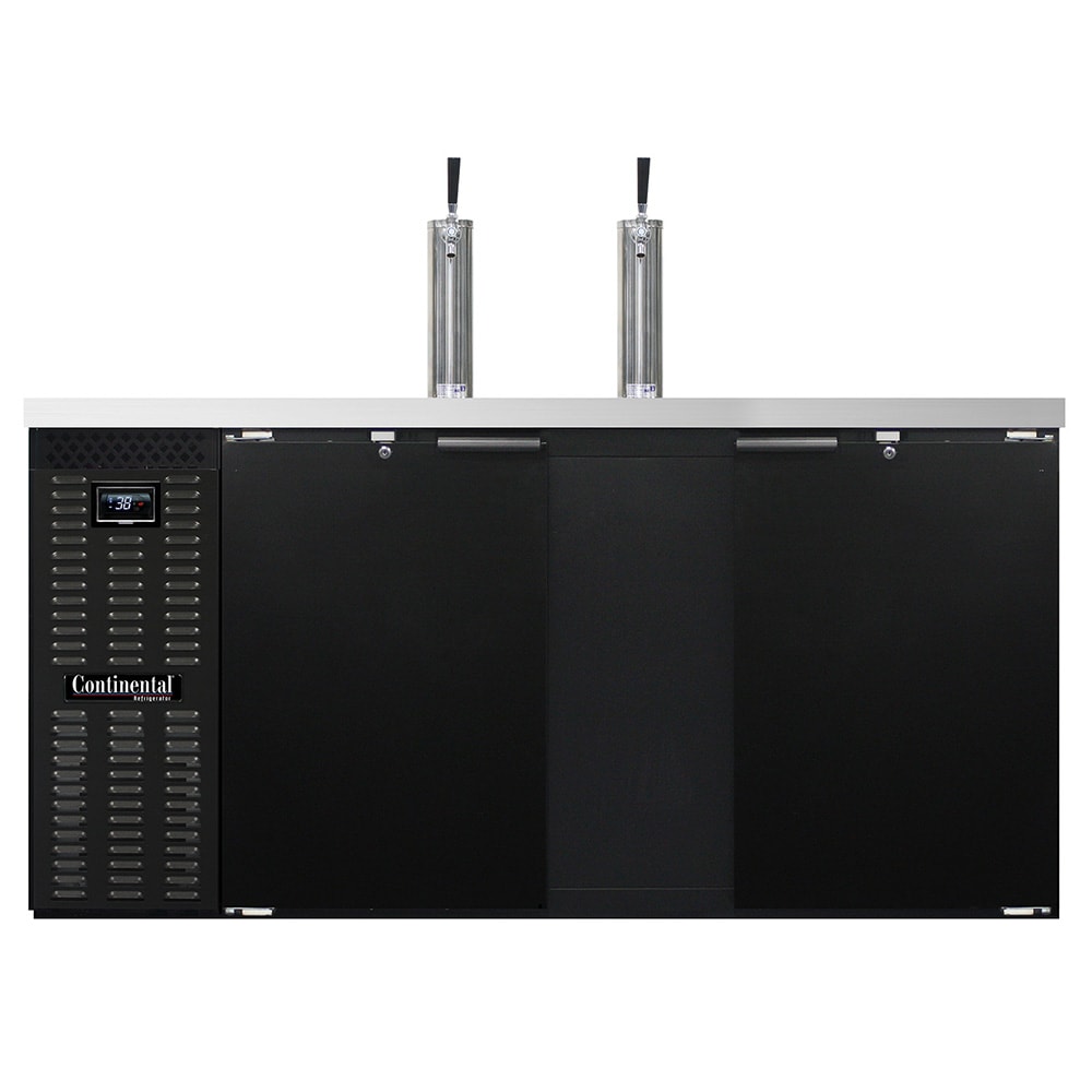 The two 3-inch-diameter beer columns on the Continental Refrigeration KC69N draft beer system include lever faucets and continuous cooling technology, while its low-profile, black enamel-finished cabinet comes with a steel drip grate and a cleanout drainage hose. Insulated with polyurethane, this unit has a stainless steel countertop with three venting louvered grills on the front, side, and back. Equipped with cylinder-keyed security locks, the two doors come with magnetic snap-in gaskets that can be removed for cleaning. Its lit interior is galvanized and constructed with a stainless steel floor. The front-breathing refrigeration system uses R134A refrigerant and is controlled with a digital display and a hi-low alarm. For convenient access, the condensing unit slides out and features an automatic, non-electric condensate evaporator.