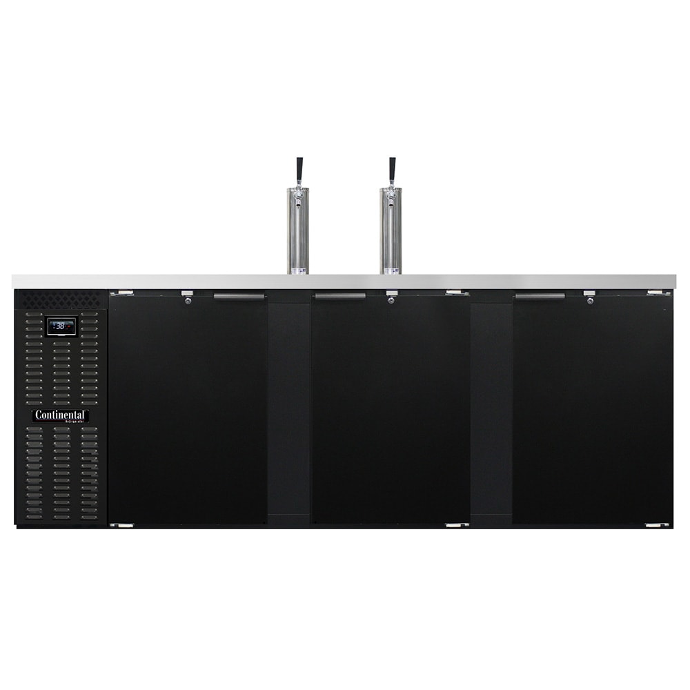 Keg Cooler, 90″W, 35.0 cu. ft., front breathing, (4) barrel or (5) straight wall keg capacity, stainless steel top with (2) columns & drainer, (3) doors with locks, electronic controller with digital display & hi-low alarm, black enamel finish exterior, stainless steel interior back & side panels with reinforced stainless steel floor, self-contained refrigeration, R290 Hydrocarbon refrigerant, 1/2 HP, cETLus, NSF, Made in USA