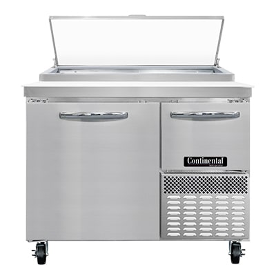 Pizza Prep Table, 43″W, one-section, 12.0 cu ft capacity, forced air, 300 series stainless steel work top with 19″ poly cutting board, (1) full & (1) half height field rehingeable doors, hot gas condensate evaporator, stainless steel front & end panels, aluminum interior, knob-type electronic controller, unit comes standard with expansion valve, side-mounted refrigeration, reversing condenser fan, R290 Hydrocarbon refrigerant, 1/3 HP, cETLus, NSF, Made in USA