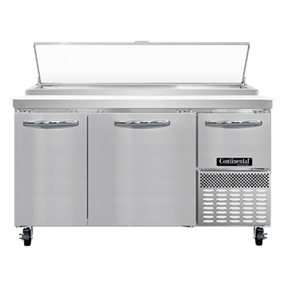 Pizza Prep Table, 60″W, two-section, 19.0 cu ft capacity, forced air, 300 series stainless steel work top with 19″ poly cutting board, (2) full & (1) half-height field rehingeable doors, hot gas condensate evaporator, stainless steel front & end panels, aluminum interior, knob-type electronic controller, unit comes standard with expansion valve, side-mounted refrigeration, reversing condenser fan, R290 Hydrocarbon refrigerant, 1/3 HP, cETLus, NSF, Made in USA