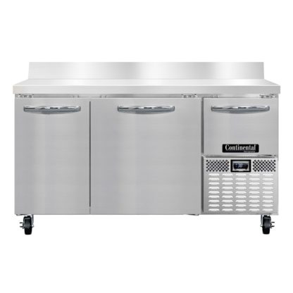 The Continental Refrigerator RA60NBS refrigerated worktop has a resilient stainless steel work surface that can be used for prepping food. It has a backsplash at the rear, keeping food from spilling behind the unit. A refrigerated cabinet offers undercounter storage shelves for prepared meals or ingredients.