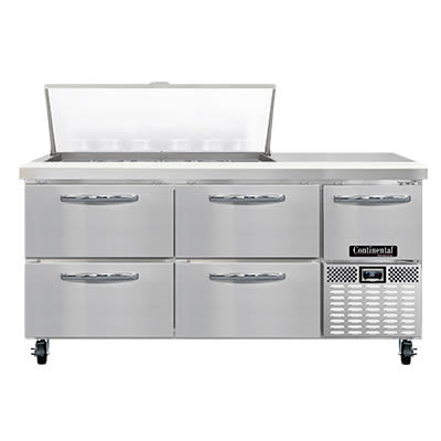 Refrigerated Base Sandwich Unit, 68″W, 300 series stainless steel (Mighty) top with (18) 1/6 size x 4″ deep pans, stainless steel front & sides, galvanized steel case back, aluminum interior, 10″ deep nylon cutting board, (4) drawers – top drawers hold (1) 12″ x 20″ + (3) 1/6 pans each & Bottom drawers holds (2) 12″ x 20″ pans each, (1) half height field rehingeable door, electronic controller with digital display, unit comes standard with expansion valve, hot gas condensate evaporator, 1/3 HP, side-mounted refrigeration, R290 Hydrocarbon refrigerant, cETLus, NSF, Made in USA