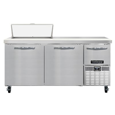 Refrigerated Base Sandwich Unit, 68″W, 300 series stainless steel top with (8) 1/6 size x 4″ deep pans, stainless steel front & sides, galvanized steel case back, aluminum interior, 12″ deep nylon cutting board, (2) full & (1) half height field rehingeable doors, electronic controller with digital display, unit comes standard with expansion valve, hot gas condensate evaporator, 1/3 HP, side-mounted refrigeration, R290 Hydrocarbon refrigerant, cETLus, NSF, Made in USA
