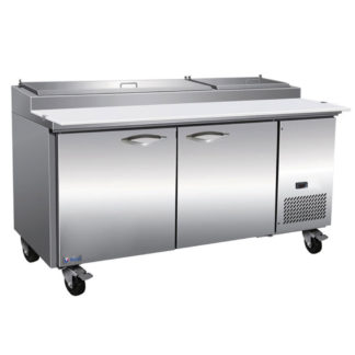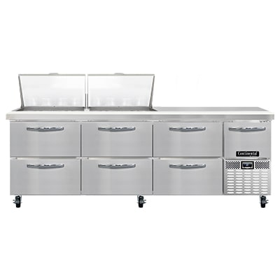 Refrigerated Base Sandwich Unit, 93″W, 300 series stainless steel (Mighty) top with (24) 1/6 size x 4″ deep pans, stainless steel front & sides, galvanized steel case back, aluminum interior, 10″ deep nylon cutting board, (6) drawers – top drawers hold (1) 12″ x 20″ + (3) 1/6 pans each & Bottom drawers holds (2) 12″ x 20″ pans each, (1) half height field rehingeable door, electronic controller with digital display, unit comes standard with expansion valve, hot gas condensate evaporator, 1/3 HP, side-mounted refrigeration, R290 Hydrocarbon refrigerant, cETLus, NSF, Made in USA