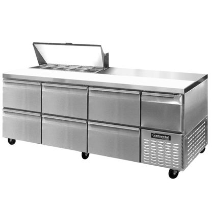 The 12″ deep cutting board makes it easy to assemble food products quickly in one area, and thanks to its bottom storage section, you can keep extra ingredients nearby for refill at a moment’s notice. This unit also features six stainless steel drawers. The top drawers can hold up to one 12″ x 20″ pan and three 1/6 size pans up to 6″ deep. The bottom drawers can hold up to two 12″ x 20″ pans up to 6″ deep. It also has a small refrigerated section above the condensing unit, accessible via a self-closing door.