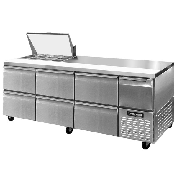 The 10″ cutting board makes it easy to assemble food products quickly in one area, and thanks to its bottom storage section, you can keep extra ingredients nearby for refill at a moment’s notice. This unit features six stainless steel drawers. The top drawers can each hold up to one 12″ x 20″ pan and three 1/6 size pans up to 6″ deep. The bottom drawers can each hold up to two 12″ x 20″ pans up to 6″ deep. It also has a small refrigerated section above the condensing unit, accessible via a self-closing door.
