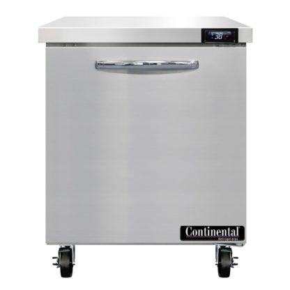 The Continental Refrigeration SW27N one-section worktop refrigerator optimizes limited kitchen space. It keeps products chilled inside its insulated cabinet, where a steel, epoxy-coated shelf keeps items organized. The doors are spring loaded and self-close, limiting cold air loss. Stainless steel exterior walls provide a polished finish and extra protection against rust, scratches, and dents. The compressor of the Continental Refrigeration SW27N worktop refrigerator is back mounted. It needs three inches of clearance on the sides, front, and rear if placed directly against a wall so hot air can escape. This unit is mounted on 5-inch casters, supporting it for maintenance relocation.