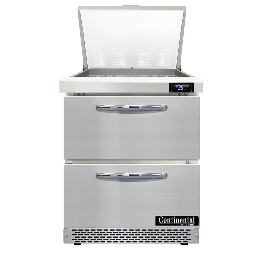 With its stainless steel and aluminum construction, the Continental Refrigerator SW27N12M-FB-D commercial sandwich table is resilient and has a long service life. Its cabinet is insulated with two inches of polyurethane foam to help keep stored product cold. The cabinet has two drawers that can each hold a full-size food pan-perfect for storing premade sandwiches.
