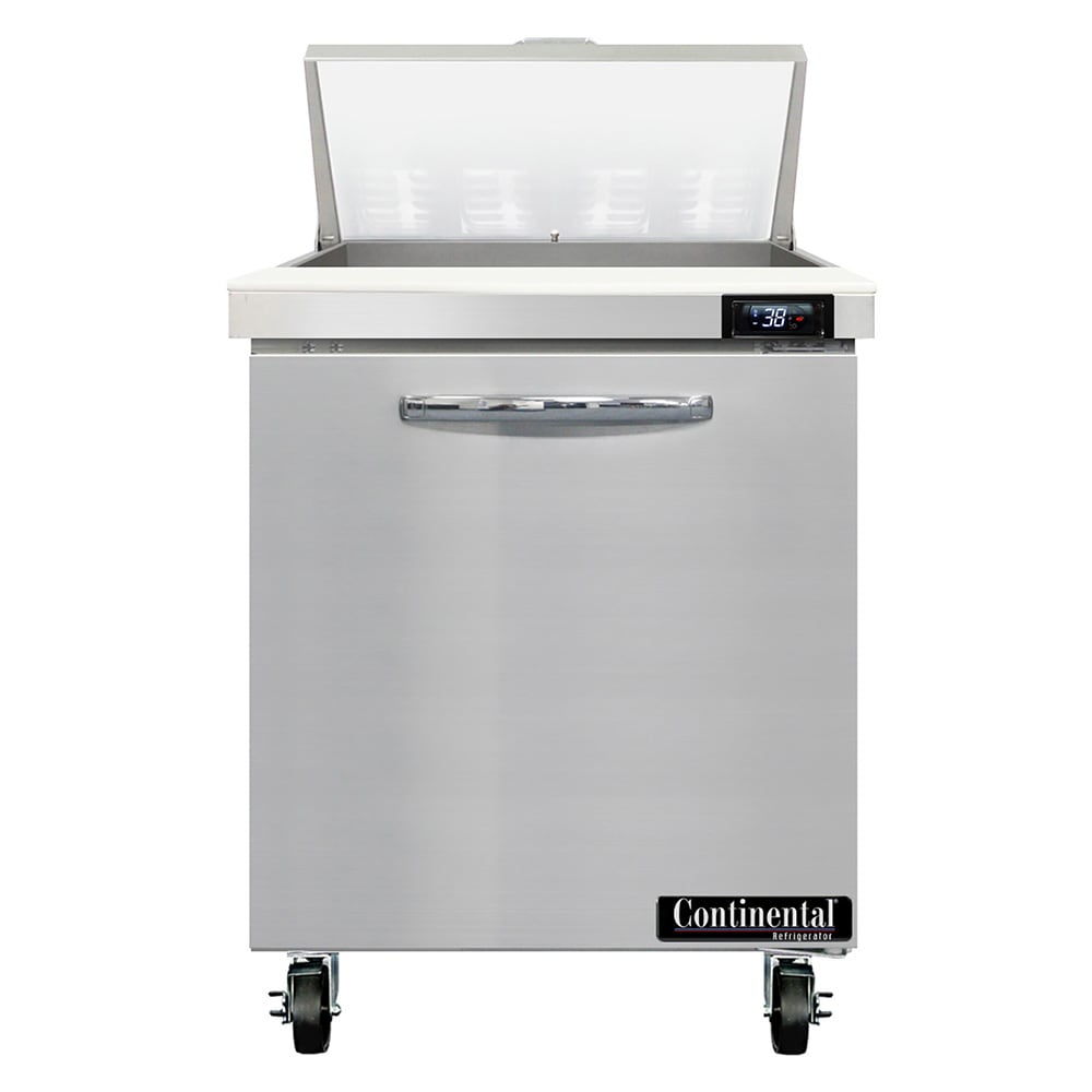 The Continental Refrigeration SW27N8 sandwich prep unit is constructed of stainless steel and aluminum for durability. Its door has a chrome handle and closes by itself, preventing spikes in temperature. Polyurethane insulation is foamed-in-place to increase cold air retention and structural strength of the base. It comes with one shelf, which is epoxy coated and corrosion resistant. Up top, the cutout holds a removable tub and has room for eight sixth-size pans. This tub catches spills or liquids and can be removed for cleaning.