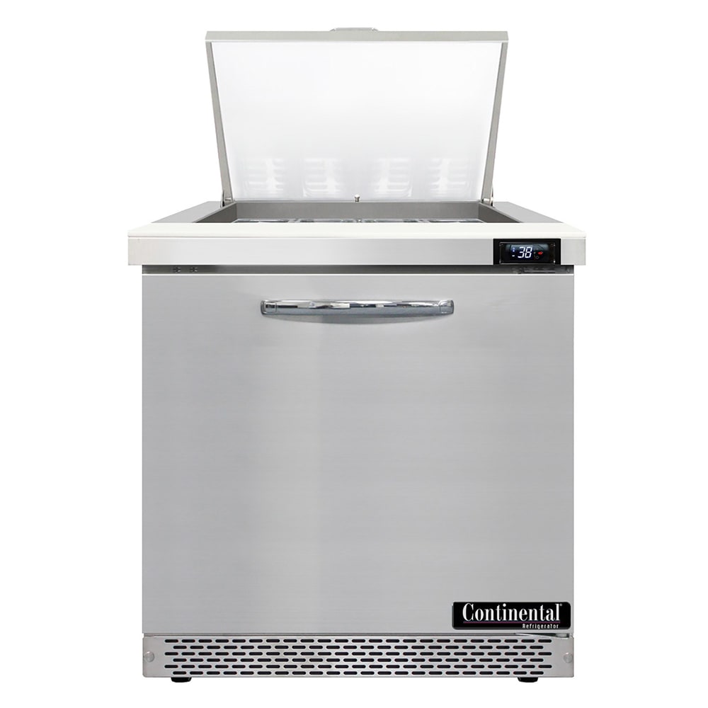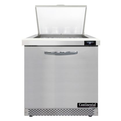 The Continental Refrigerator SW23N12M-FB sandwich and salad prep table has a mighty top design that accommodates 12 sixth-size food pans, which are included. Its base is also refrigerated, and it comes with an epoxy-coated wire shelf that holds bulk ingredients. To give users a surface to prepare fresh dishes, a nylon cutting board, 10 inches deep, is mounted on the front of the unit.