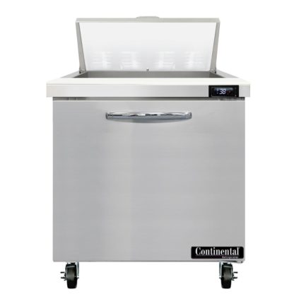 An electronic controller lets users set the Continental Refrigerator SW32N8 prep table’s temperature between 33 and 41 degrees Fahrenheit. If this level gets too high or too low, the unit sounds an alarm to let nearby staff know it needs attention. So users can assemble fresh salads and sandwiches, a nylon cutting board is mounted along the refrigerator’s front.