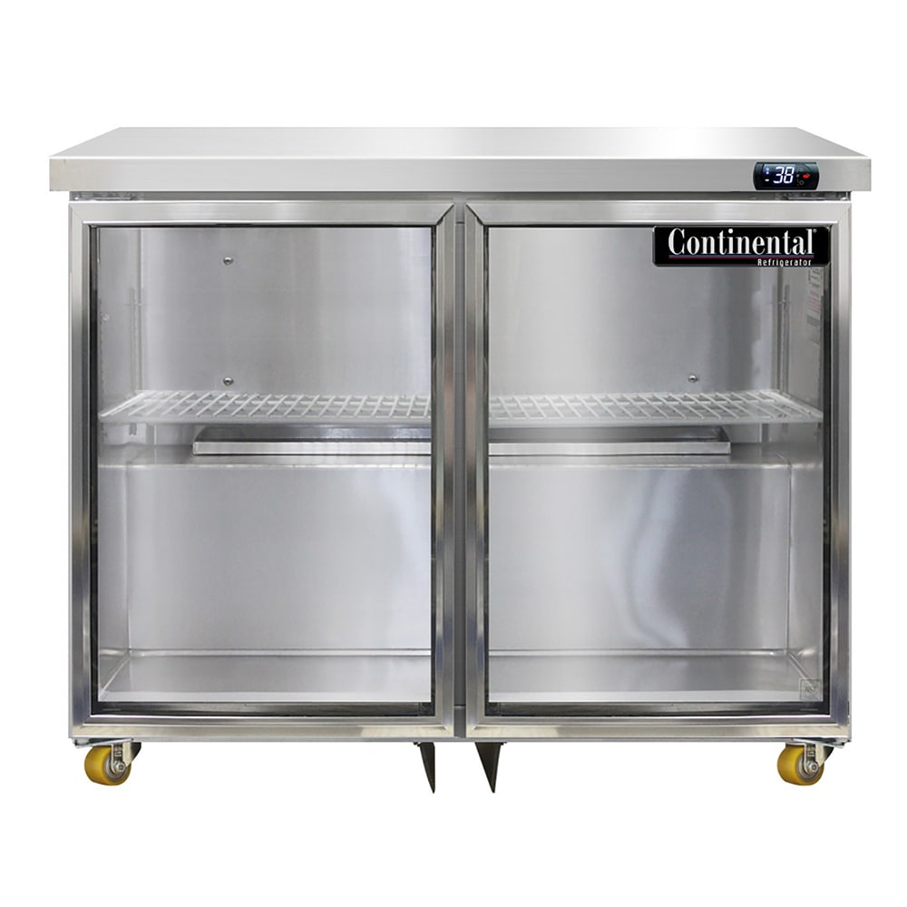 With double pane, low-e glass doors and LED interior lighting, the Continental Refrigeration SW36NGD-U undercounter refrigerator enables visibility. For storing food products, the cabinet includes heavy-duty, epoxy-coated steel shelves, while the case back is entirely enclosed, removable, and vented. Made of stainless steel with an aluminum back and interior, this unit is durable and can be wiped clean.