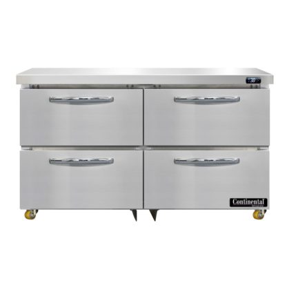 Four drawers on the Continental Refrigeration SW48N-U-D commercial undercounter refrigerator have ergonomically friendly chrome handles and magnetic gaskets for tight seals while shut. Its condensate evaporator eliminates excess water automatically and its coil is plasticized to resist corrosion. This refrigerator is mounted on casters, simplifying transportation if it must be relocated, and the case back is removable for maintenance and cleaning. To provide durability, the front, ends, and top are made of stainless steel.