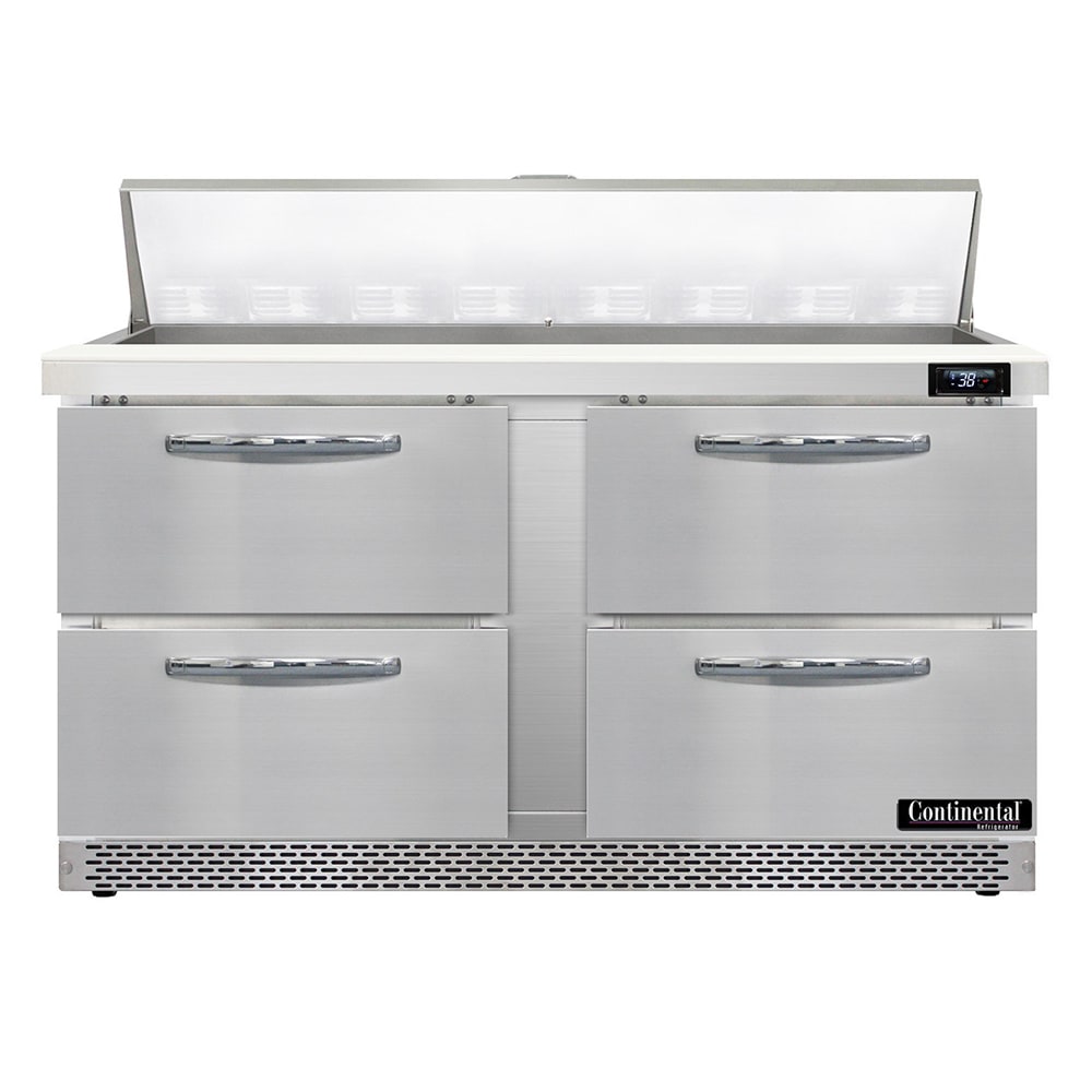 The Continental Refrigeration SW60N16-FB-D sandwich and salad prep table includes a full-length nylon cutting board for slicing meats, cheese, and vegetables. With 16 food pans, various ingredients can be stored up top for instant use and each drawer accommodates another full-size food pan for storage. This unit’s self-contained refrigeration system uses R-290 hydrocarbon refrigerant-an environmentally friendly choice. Using electronic controls, the temperature can be adjusted between 33 and 41 degrees Fahrenheit; if this number changes, a high/low alarm alerts those nearby.