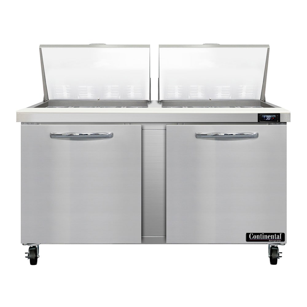 This Continental Refrigerator SW60N24M prep table has a refrigerated base for additional ingredient storage. The base doors self-close, preventing them from being left open, while magnetic gaskets create a tight seal around the opening. When stocking, employees can place product on the two shelves and floor, and they can adjust the internal temperature using the electronic controls. These controls feature an external display and high/low temperature alarm for monitoring.
