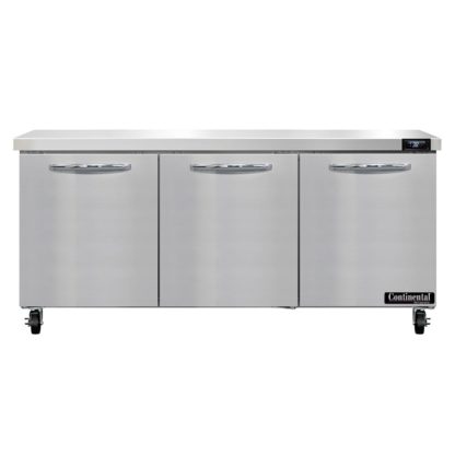 Work Top Refrigerator, 72″W, 20.6 cu ft capacity, three-section, stainless steel flat top, (3) field rehingeable doors, stainless steel front & end panels, aluminum interior, rear mounted self-contained refrigeration, R290 Hydrocarbon refrigerant, 1/5 HP, cETLus, NSF, Made in USA, ENERGY STAR