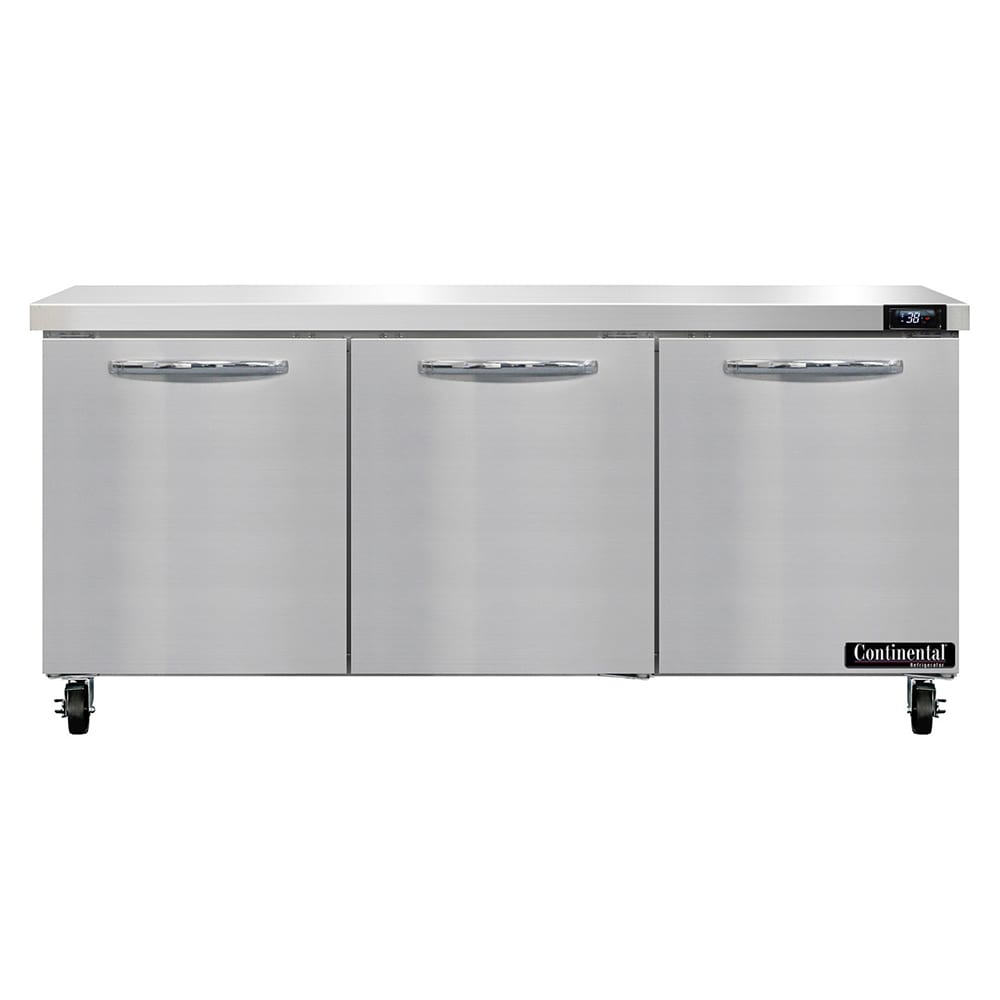 This Continental Refrigeration SW72N commercial worktop refrigerator is durable due to its stainless steel top, front, and ends, and the aluminum interior and back. Its solid doors close on their own to preserve energy and are fitted with snap-in gaskets to hold in cold air. To reduce energy use further, the cabinet is insulated with polyurethane foam. This unit has three heavy-duty shelves for product storage; each is coated in epoxy to resist corrosion.