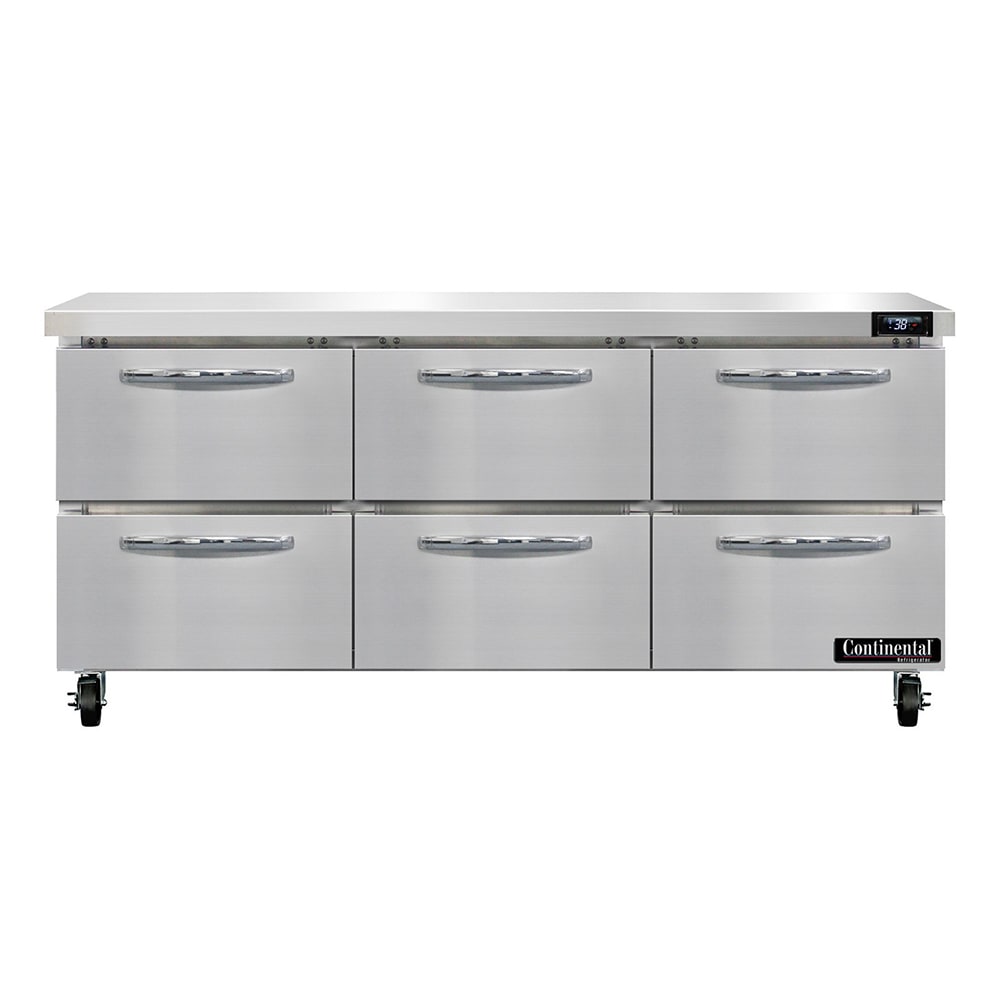 Users can store food pans full of fresh ingredients in six drawers in the Continental Refrigerator SW72ND worktop refrigerator. Providing durability and an attractive finish, its top, ends, and front are all made of stainless steel while its interior is made of aluminum. To maintain temperatures inside the unit, the cabinet is insulated with 2 inches of polyurethane foam.