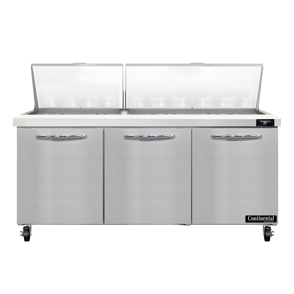 The Continental Refrigeration SW72N30M prep table has three self-closing, spring-loaded doors that can be rehinged in the field and include magnetic gaskets and smooth, polished door handles. This unit has three epoxy-coated shelves for storage, a full-length nylon cutting board, and 30 recessed pans for various ingredients, ideal for use in sandwich shops. A removable interior tub is located beneath the food pans and the entire cabinet is portable, using 5-inch casters for rolling.