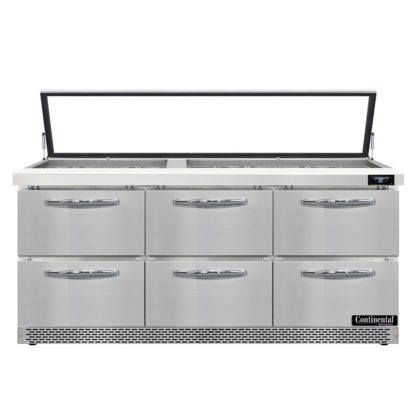 Mighty Top Sandwich Unit with Hinged Glass Lid, Front Breather, 72″W, 20.6 cu ft capacity, three-section, (30) 1/6 size x 4″ deep pans with 8″ cutting board, (6) drawers, accommodates (1) 12 x 18 x 6 pan or (6) 1/2 pans, or (6) 1/3 pans per drawer (supplied by others), stainless steel top, front & end panels, aluminum back & interior, unit comes standard with expansion valve, 3-3/4″ casters, rear mounted self-contained refrigeration, automatic hot gas condensate evaporator, R290 Hydrocarbon Refrigerant, 1/3 HP, cETLus, NSF, Made in USA