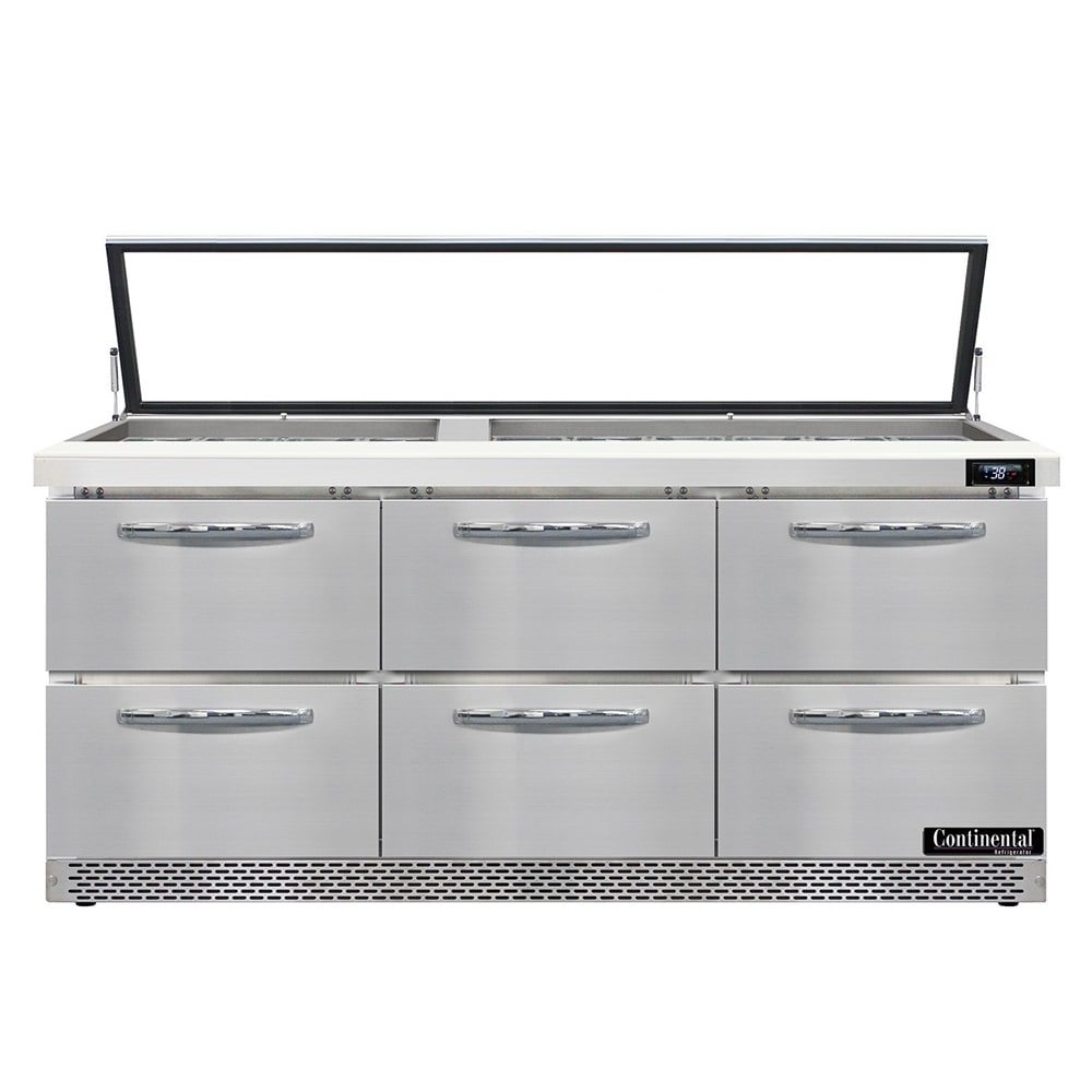 An electronic controller empowers users to set the Continental Refrigerator SW72N30M-HGL-FB-D prep table’s temperature, which can be monitored on the digital external display. The unit creates cold air with its self-contained, front-breathing refrigeration system that’s mounted in the rear. It uses R-290 refrigerant, which is an environmentally friendly hydrocarbon.