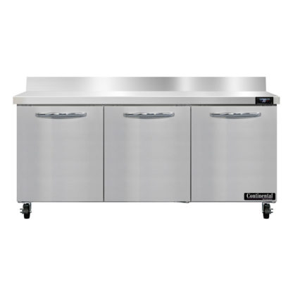Work Top Refrigerator, 72″W, 20.6 cu ft capacity, three-section, stainless steel top with 5-1/2″H backsplash, (3) field rehingeable doors, stainless steel front & end panels, aluminum interior, rear mounted self-contained refrigeration, R290 Hydrocarbon refrigerant, 1/5 HP, cETLus, NSF, Made in USA, ENERGY STAR