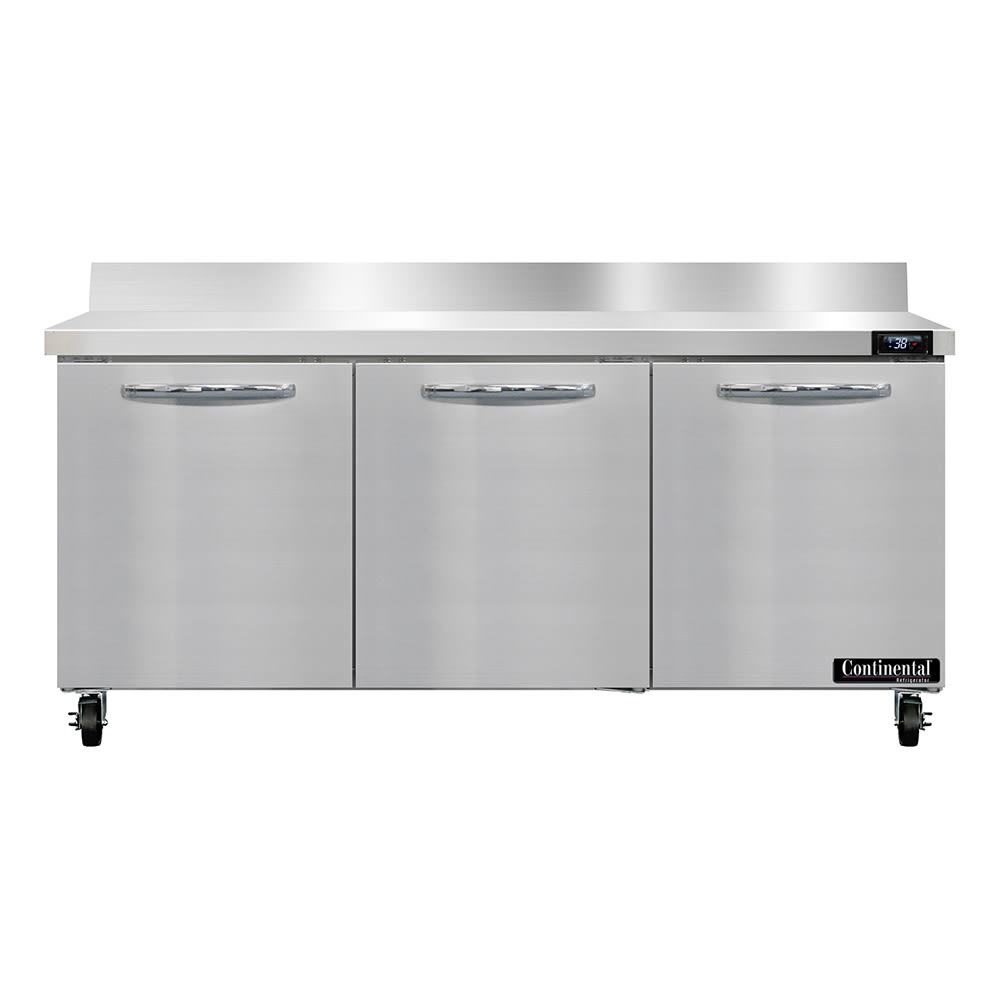 This Continental Refrigerator SW72NBS worktop refrigerator is mounted on casters, so users can move it around the kitchen when it must be cleaned or accessed for service. Users can monitor its temperature by checking the digital display, which is located on its exterior for convenience. The stainless steel top has a backsplash that keeps food messes from splashing onto walls.