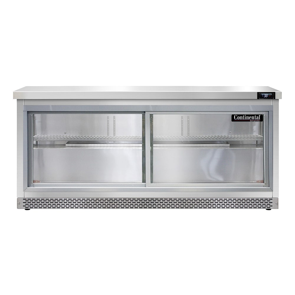 With a capacity of 20.6 cubic feet, the Continental Refrigerator SW27NSGD-FB display worktop refrigerator stores plenty of ingredients and prepackaged foods. Sliding glass doors enhance product visibility and access. Its aluminum interior is equipped with LED lighting, maximizing product visibility for employees and customers.