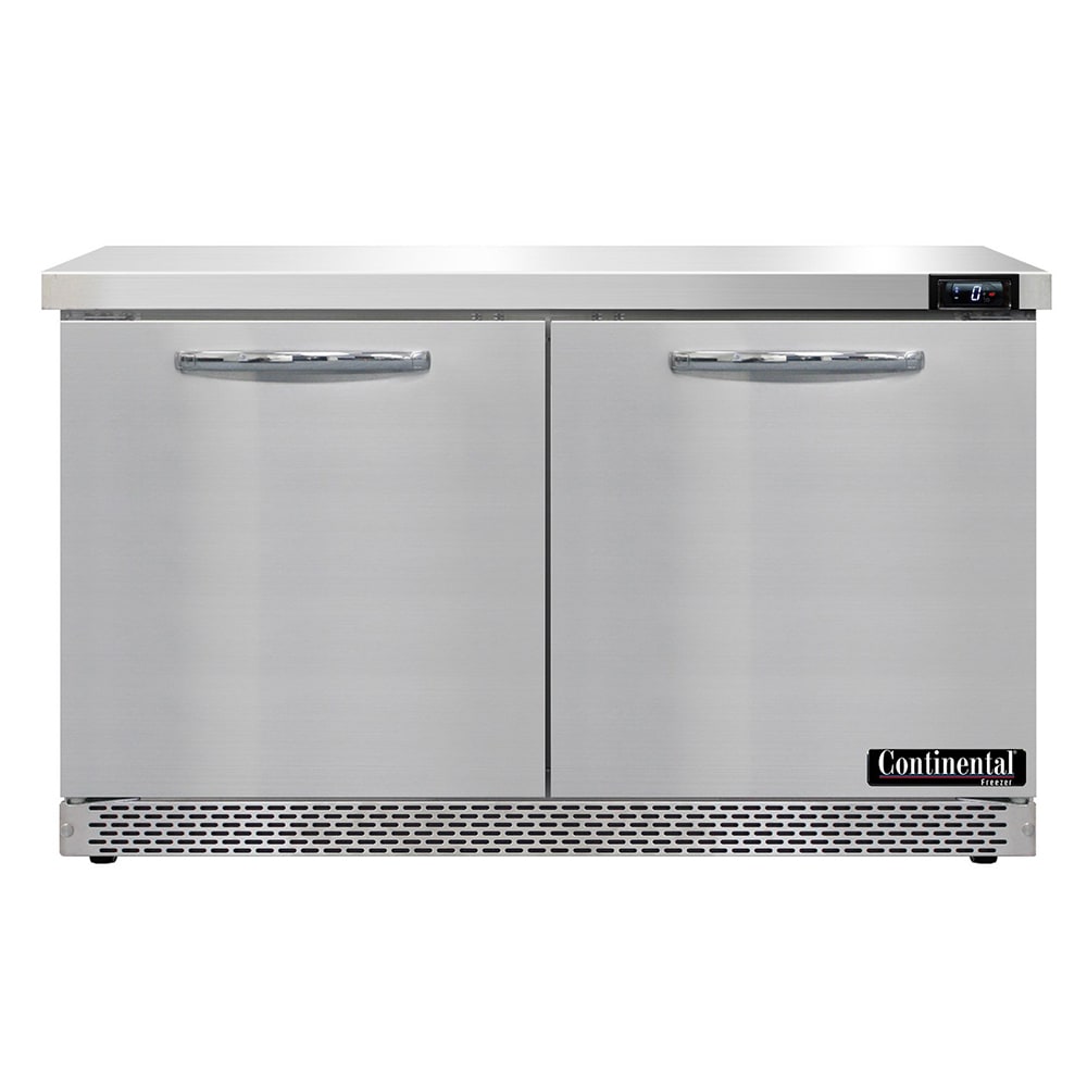 Work Top Freezer, Front Breather, 48″W, 13.4 cu ft capacity, two-section, stainless steel flat top, (2) field rehingeable doors, stainless steel front & end panels, aluminum interior, 3-3/4″ casters, rear mounted self-contained refrigeration, R290 Hydrocarbon refrigerant, 1/2 HP, cETLus, NSF, Made in USA