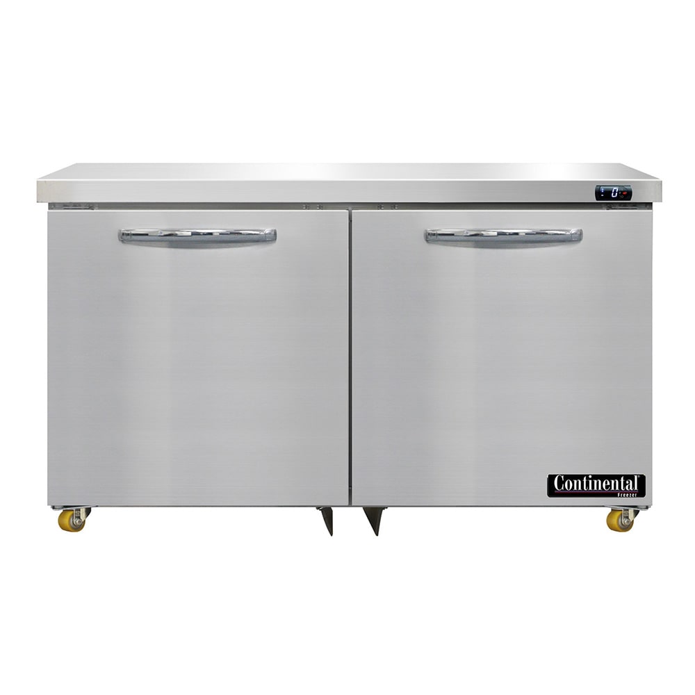 The self-contained refrigeration system of the Continental Refrigerator SWF48N-U commercial freezer is located in the back for maintenance access, and to reach the compressor, users can roll the unit away from the wall on its mounted-on plate casters. Cooling the unit, the freezer uses R290 hydrocarbon refrigerant, which is both highly efficienct and safe for the environment. Built to withstand repeated use, the top, front, and ends are made of stainless steel, and the back and interior are made of aluminum.