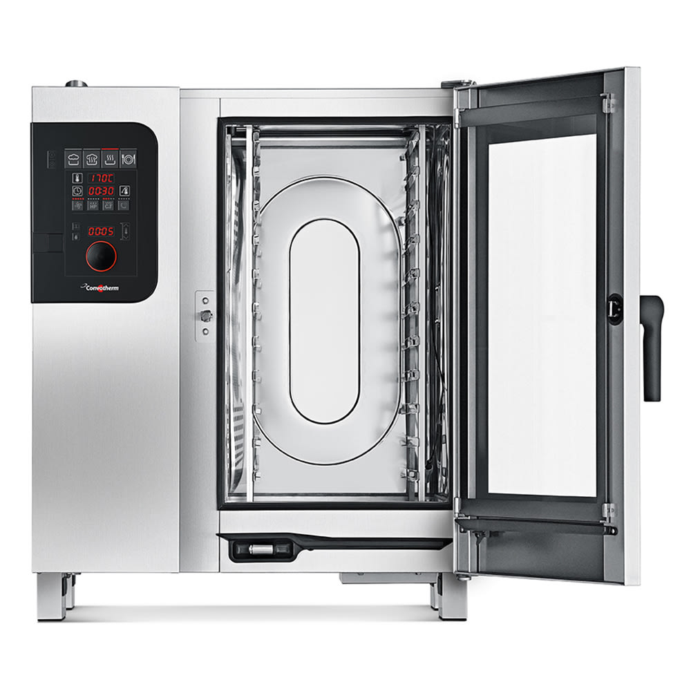 The combi oven has four cooking modes for a variety of cooking options. The hot air, steam, combi steam, and retherm modes provide varying temperatures and functions for four separate applications. The Convotherm C4 ED 10.10ES combi oven is regulated by a control panel with an attractive and functional digital display. A USB port is located on the control panel for storage of up to 99 recipes with 9 steps.