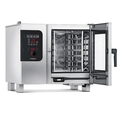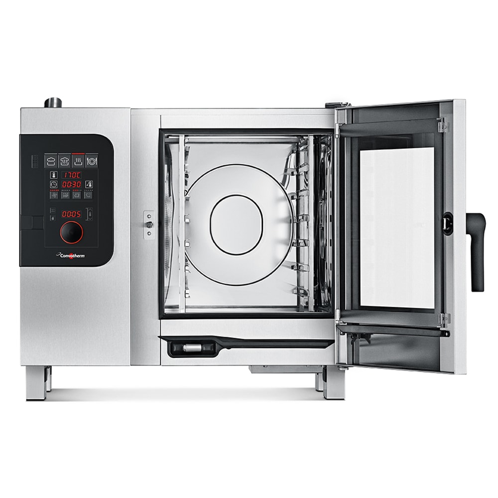 Convotherm Combi Oven/Steamer, electric, boilerless, (6) 13″ x 18″ half size sheet pan or (6) 12″ x 20″ x 2-1/2″ hotel pan capacity, easyDial control panel with digital display 9-stage & 99 cooking recipes storage, (4) cooking modes: hot air, steam, combi-steam & retherm, multi-point core temperature probe, five-speed auto reversing fan, anti-microbial hygienic door handle, pull-out spray hose, stainless steel construction, 208-240v/60/3ph