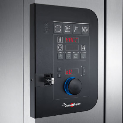 This half-size unit has 7 shelves that can accommodate pans, baskets, racks, and plates. The air is circulated in the cooking chamber with a five-speed fan to ensure all product is evenly heated. The operator is able to control the temperature, time, fan, and more with the functions on the Convotherm C4ED6.10ES combi-oven’s control panel. The panel is antibacterial, along with the door handle. The door has a safety latch that protects users from interior steam.