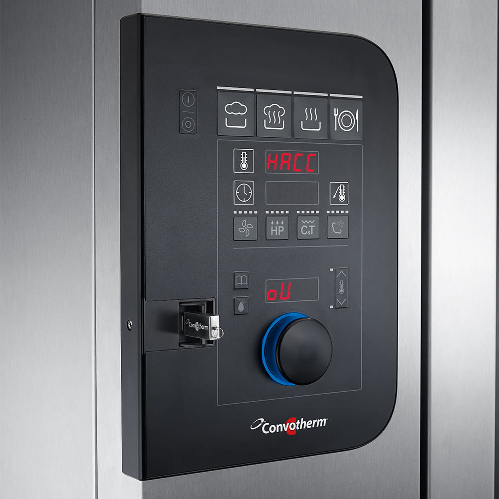 The Convotherm C4ED6.10ES combi-oven has three primary cooking modes: hot air, steam, combi steam. The retherm setting is used for reheating foods to serving temperatures. The oven also has preheat and cool down functions, which allow the unit proper time for warming and cooling to maximize production quality. The oven’s temperature is monitored by an interior temperature probe with a convenient readout on the exterior control panel.
