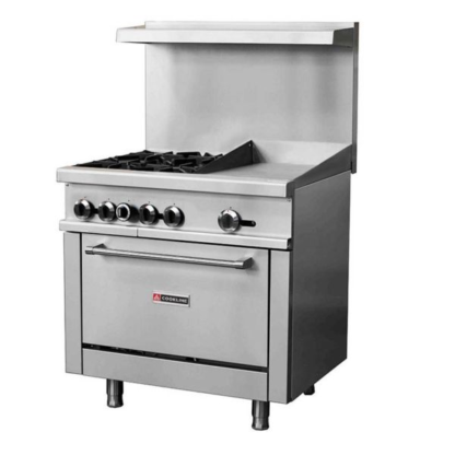 This Cookline stainless steel gas range with gas oven is a valuable addition to any commercial kitchen. Our natural gas range brings efficiency, reliability, and improved performance to your kitchen because it allows you to simmer, boil, saute effortlessly, warm, and bake a variety of menu items. This unit comes with four 30,000 BTU/hr open top burners, a 12″ right side griddle, and standard bottom oven. Prepare the best appetizers, entrees, desserts, and other special treats in your foodservice establishment with this high-performance gas range oven.