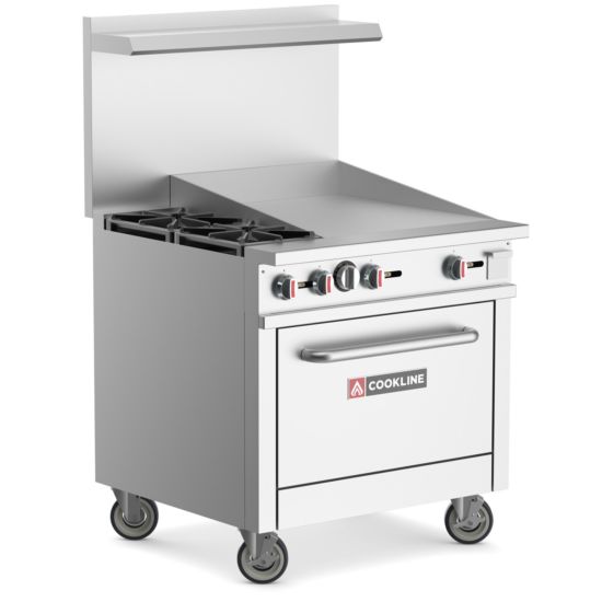 This Cookline stainless steel gas range with gas oven is a valuable addition to any commercial kitchen. Our Cookline range brings efficiency, reliability, and improved performance to your kitchen because it allows you to simmer, boil, saute effortlessly, warm, and bake a variety of menu items. This unit comes with four 30,000 BTU/hr open top burners, a 24″ right side griddle, and standard bottom oven. Prepare the best appetizers, entrees, desserts, and other special treats in your foodservice establishment with this high-performance gas range oven.
