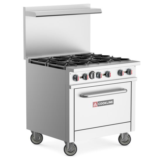 This gas range oven brings efficiency and reliability to your kitchen. Powered by 30,000 BTU/Hour cast iron burners, and featuring a robust stainless steel construct with inbuilt safety features, the Cookline commercial gas stove is made for the heavy lifting. Effortlessly boil, simmer, saute, or perform a variety of cooking tasks simultaneously with the multiple burners and heavy-duty cast-iron grates. A U-Shape oven burner with 31,000 BTU/Hr brings the extra punch you need to run a busy commercial kitchen smoothly. Built to provide higher-performance over longer durations than standard gas range stoves, this unit is perfect for your versatile kitchen needs.
