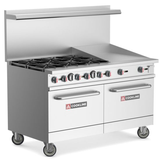 This gas range oven brings efficiency and reliability to your kitchen. Powered by 30,000 BTU/Hour cast iron burners, and featuring a robust stainless steel construct with inbuilt safety features, the Cookline commercial gas stove is made for the heavy lifting. Effortlessly boil, simmer, saute, or perform a variety of cooking tasks simultaneously with the multiple burners and heavy-duty cast-iron grates. A U-Shape oven burner with 31,000 BTU/Hr brings the extra punch you need to run a busy commercial kitchen smoothly. Built to provide higher-performance over longer durations than standard gas range stoves, this unit is perfect for your versatile kitchen needs.