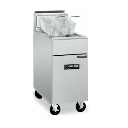 No gas? No problem with Cookline UF-40E 40 lb. electric floor deep fryer. Designed to be efficient and easy to use, this 15.75″ deep fryer includes a stainless steel fry pot rated for 40 lb. of oil. Two twin baskets are included and the unit can support a single wide basket desired. The built-in thermostat assures quick recovery time. Slanted bottom with drain pipe makes draining and cleaning simple. *This unit should be installed by a licensed electrician.