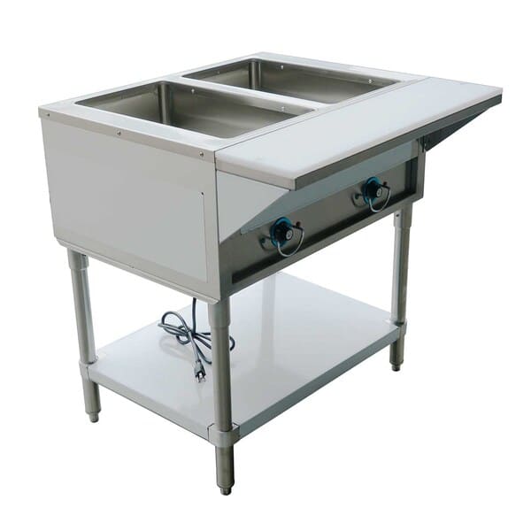 Hot Food Well Table, electric, 30″W, (2) 12″ x 20″ x 6-1/2″ wells, wet operation, 1″ corner drain, (3) infinite control settings, removable 1/2″ thick cutting board, under shelf, stainless steel construction, 120v/60/1-ph, 1.3kW, NEMA 6-20P, cETLus, ETL-Sanitation