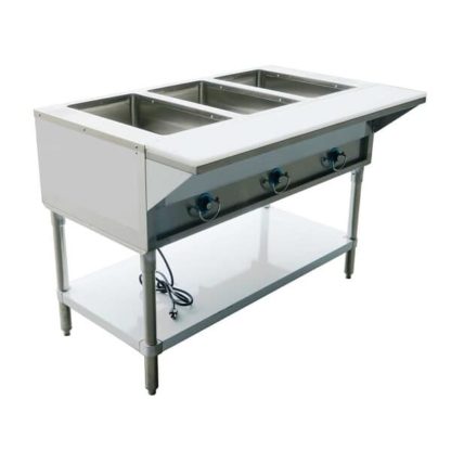 Hot Food Well Table, electric, 48″W, (3) 12″ x 20″ x 6-1/2″ wells, wet operation, 1″ corner drain, (3) infinite control settings, removable 1/2″ thick cutting board, under shelf, stainless steel construction, 120v/60/1-ph, 1.95kW, NEMA 6-20P, cETLus, ETL-Sanitation