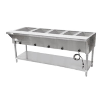 Hot Food Well Table, electric, 72″W, (5) 12″ x 20″ x 6-1/2″ wells, wet operation, 1″ corner drain, (3) infinite control settings, removable 1/2″ thick cutting board, under shelf, stainless steel construction, 208-240v/60/1-ph, 3.7-5.0kW, NEMA 6-30P, cETLus, ETL-Sanitation