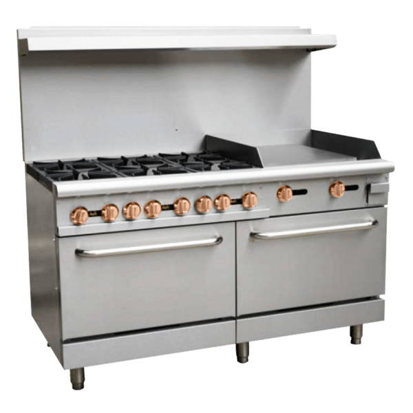 Gas, 60″W, (6) 30,000 BTU open burners, cast iron burners & grates, 24″ griddle, 3/4″ thick griddle plate, (2) standard ovens, thermostatically controlled, insulated oven doors, (2) racks per oven, U-shaped oven burner, backriser with 12″ shelf, stainless steel front/back riser & galvanized sides, (8) adjustable legs, 3/4″ NPT rear gas connection, 282,000 BTU, cETLus, ETL-Sanitation