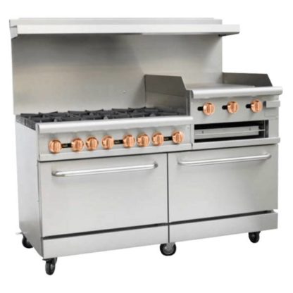 Gas, 60″W, (6) 30,000 BTU open burners, cast iron burners & grates, 24″ raised griddle, 3/4″ thick griddle plate, 8-1/4″H broiler opening with built in sliding rack, (2) standard ovens, thermostatically controlled, insulated oven doors, (2) racks per oven, U-shaped oven burner, backriser with 12″ shelf, stainless steel front/back riser & galvanized sides, (8) adjustable legs, 3/4″ NPT rear gas connection, 278,000 BTU, cETLus, ETL-Sanitation