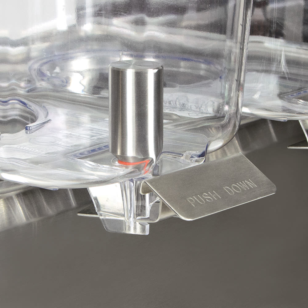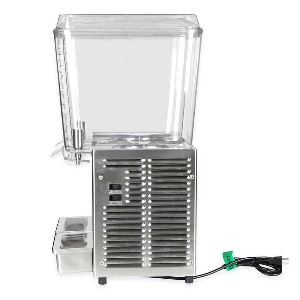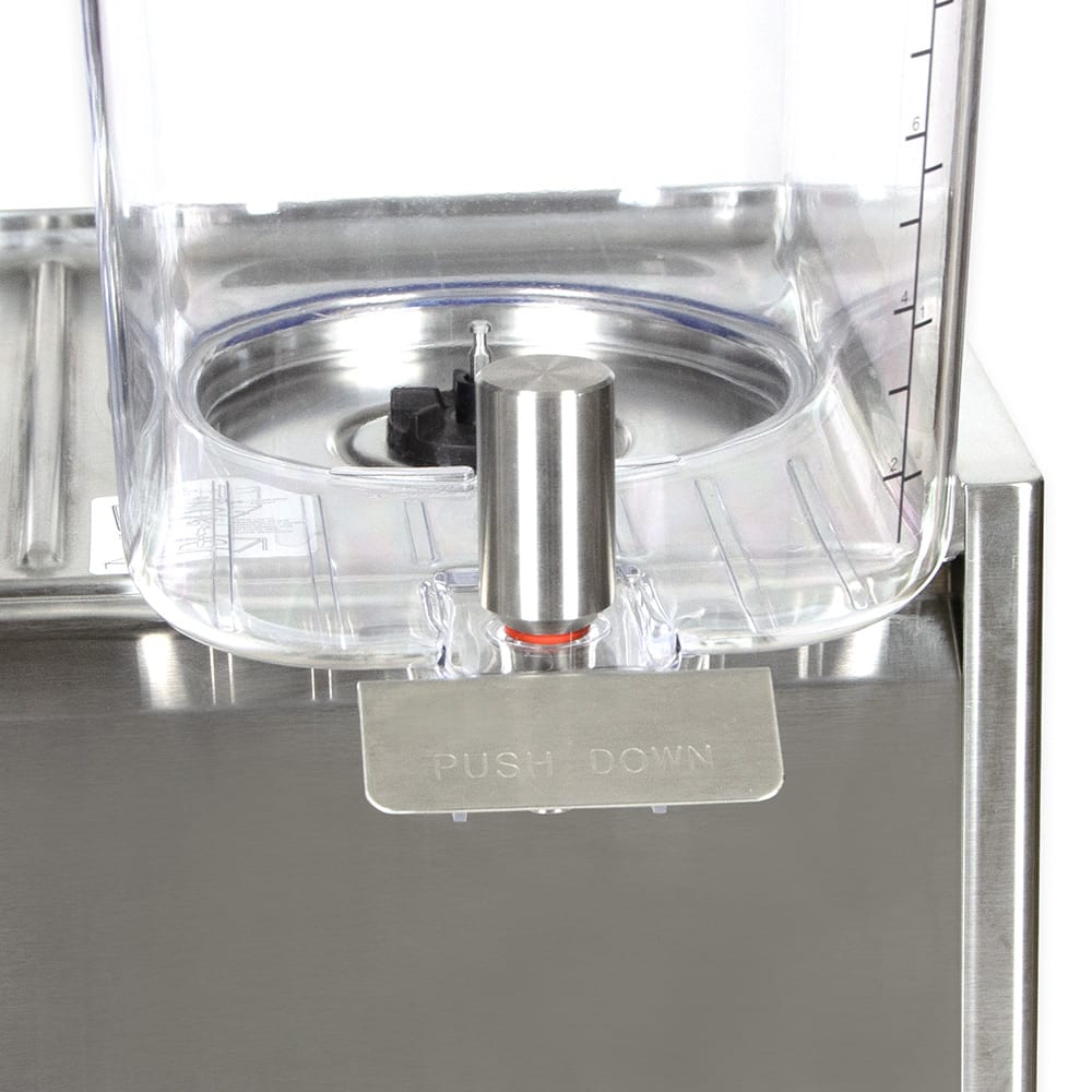 In addition to offering two different flavors, the Crathco D25-3 cold beverage dispenser’s bowls are equipped with traditional spray circulation and agitators that can be used with tea and other products that might foam. Push levers dispense the drinks, while stainless steel drip trays catch any spills that may occur. The dispensing area can fit cups as tall as 8.25 inches.