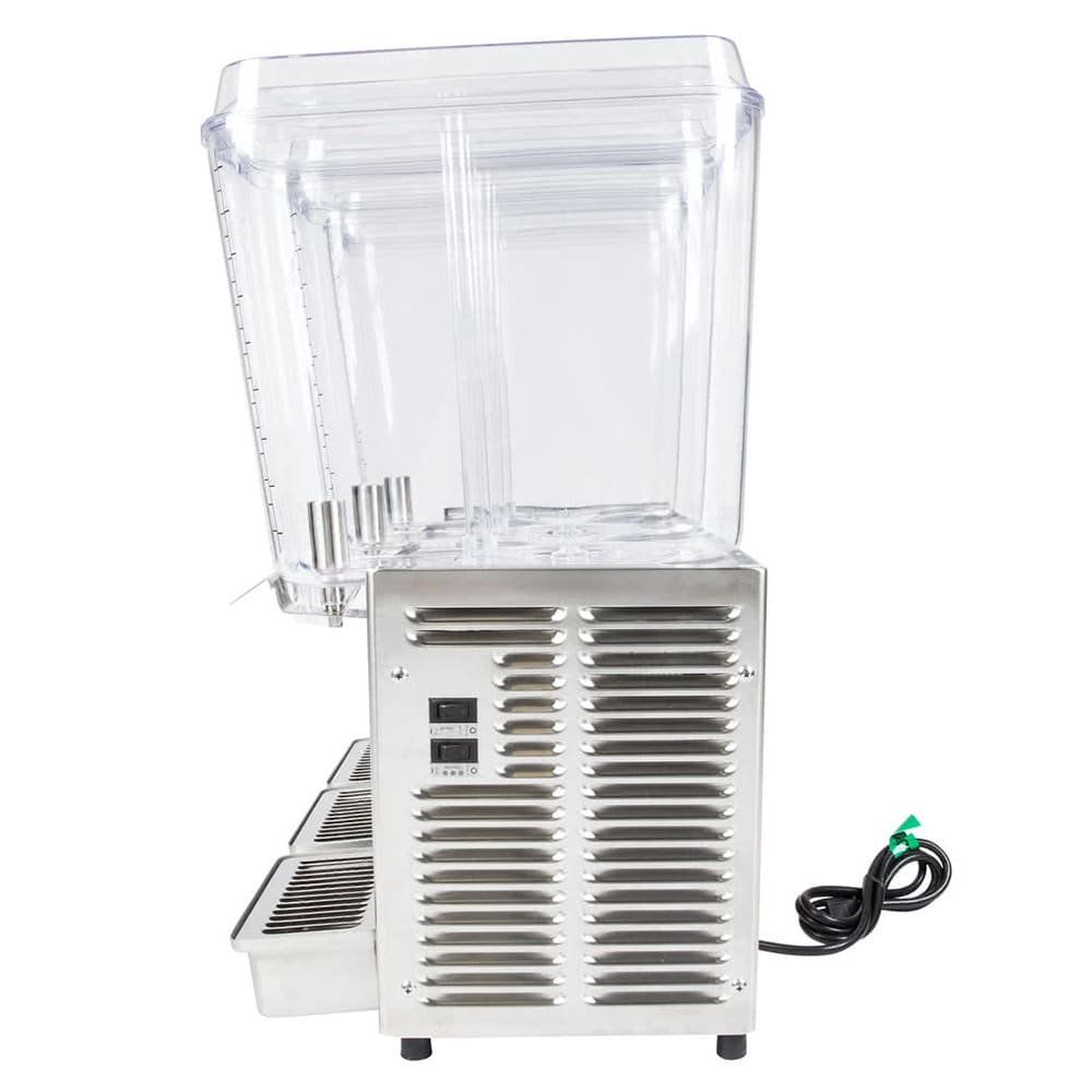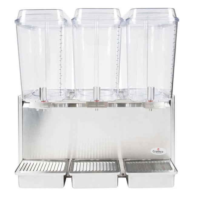 Crathco Classic Bubbler Pre-Mix Cold Beverage Dispenser, triple, electric, (3) 5 gallon clear polycarbonate bowls & covers, 2-piece stainless steel dripless dispense valves, 35°to 41°F temperature range, 8-1/4″ cup clearance, includes spray & agitate circulation options, stainless steel side panels & drip tray, R134a, 1/3 HP, cULus, NSF, (shipped in 2 boxes)