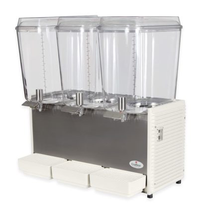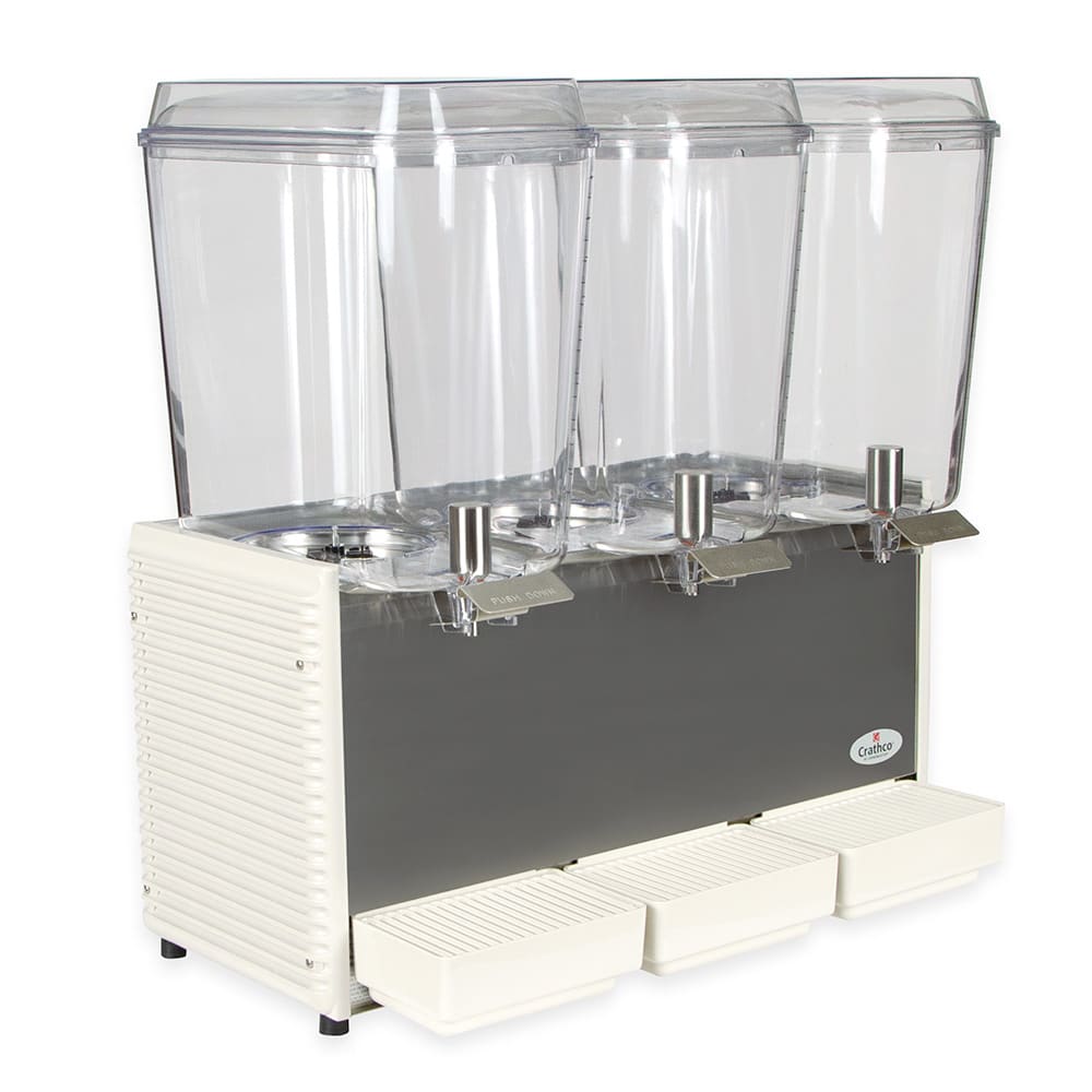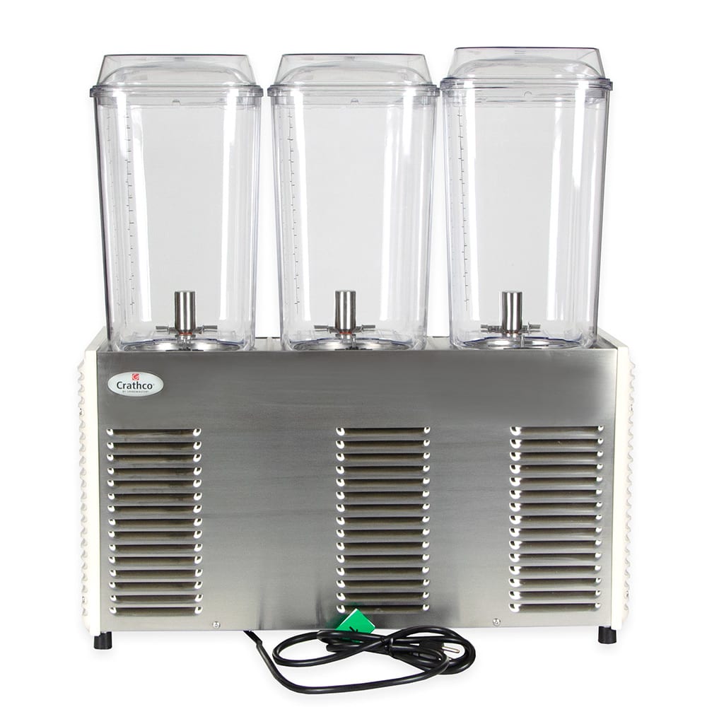 Crathco Classic Bubbler Pre-Mix Cold Beverage Dispenser, triple, electric, (3) 5 gallon clear polycarbonate bowls & covers, 2-piece stainless steel dripless dispense valves, 35°to 41°F temperature range, 8-1/4″ cup clearance, includes spray & agitate circulation options, plastic side panels & drip tray, R134a, 1/3 HP, cULus, NSF, (shipped in 2 boxes)