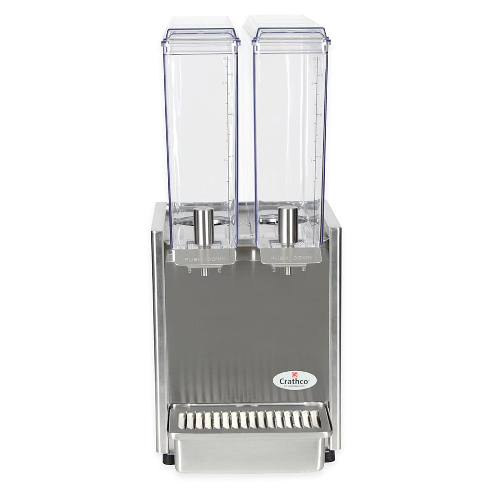 Crathco Classic Bubbler Mini-Twin Pre-Mix Cold Beverage Dispenser, electric, (2) 2.4 gallon clear polycarbonate bowls & covers, 2-piece stainless steel dripless dispense valves, 35°to 41°F temperature range, 8″ cup clearance, includes spray & agitate circulation options, stainless steel side panels & drip tray, R134a, 1/6 HP, cULus, NSF (shipped in 2 boxes)