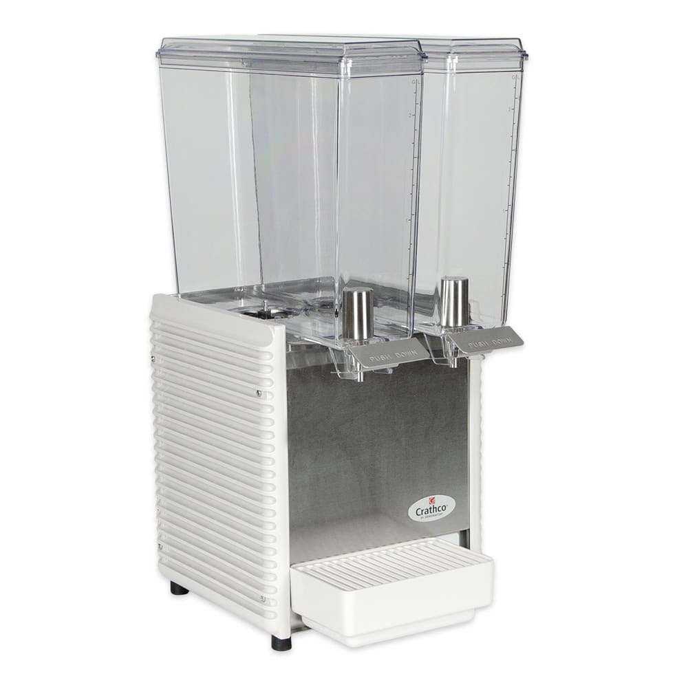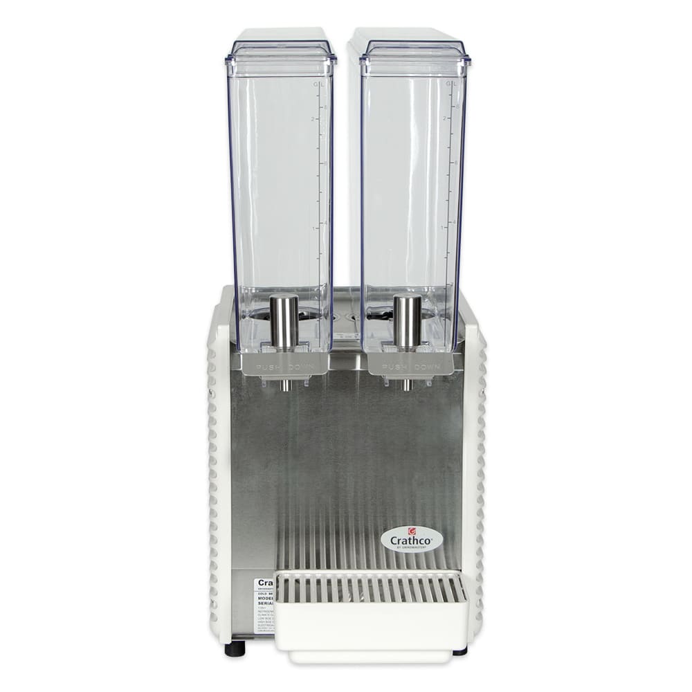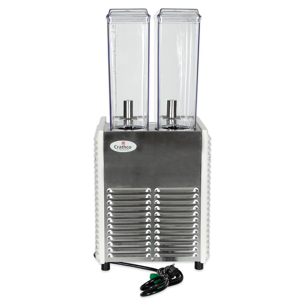 Crathco Classic Bubbler Mini-Twin Pre-Mix Cold Beverage Dispenser, electric, (2) 2.4 gallon clear polycarbonate bowls & covers, 2-piece stainless steel dripless dispense valves, 35°to 41°F temperature range, 8″ cup clearance, includes spray & agitate circulation options, plastic side panels & drip tray, R134a, 1/6 HP, cULus, NSF (shipped in 2 boxes)