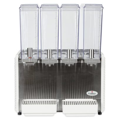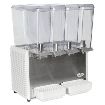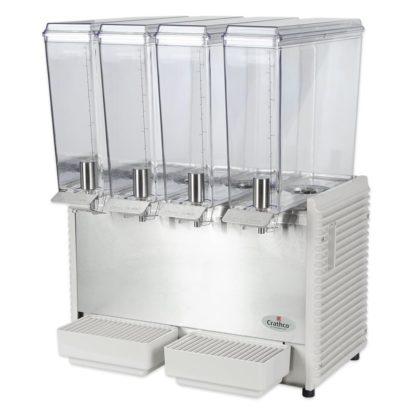 Crathco Classic Bubbler Mini-Quad Pre-Mix Cold Beverage Dispenser, electric, (4) 2.4 gallon clear polycarbonate bowls & covers, 2-piece stainless steel dripless dispense valves, 35°to 41°F temperature range, 8″ cup clearance, includes spray & agitate circulation options, plastic side panels & drip tray, R134a, 1/6 HP, cULus, NSF (shipped in 2 boxes)